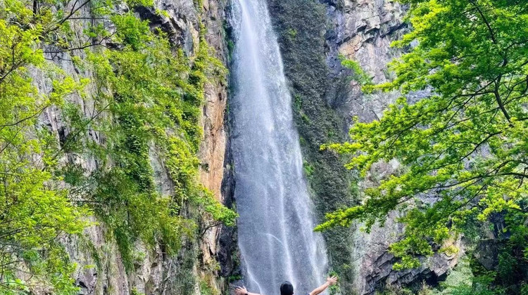 据说李白诗“日照香炉生紫烟,遥看瀑布挂前川。飞流直下三千尺,疑是银河落九天。”中的银河就是指此处,可时移世易,现在的大口瀑布已经演变成了“人文瀑布”,已不复当年气象。但是水很清凉,特别的舒服,脚往水中一伸一下子就缓解了走路带来的燥热。