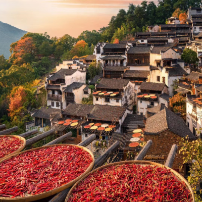 立秋一到,篁岭古村就成了一个天地晒场。来晒秋人家赏红枫,欣赏屋顶晒秋,枫林尽染,体验民风民俗,手摇风车、套南瓜等,感受晒秋人家的乡愁韵味。