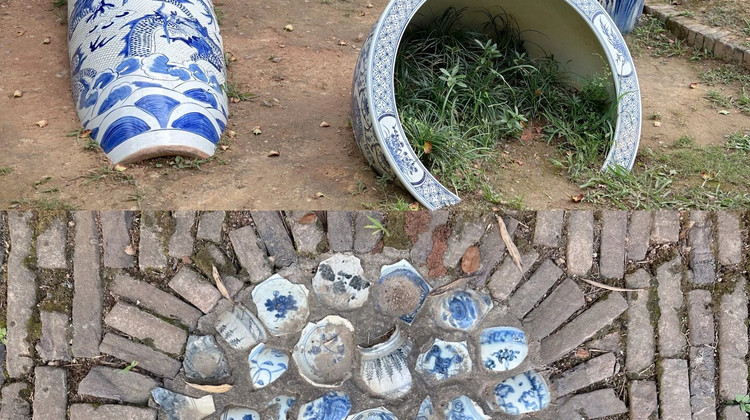进景区大门左手边是陶瓷民俗展示区,首先看到的是清代建筑群清园,穿过瓷碑长廊,走到尽头是明代建筑群明闾。瓷碑长廊西侧的瓷音水榭(水上戏台)则可以看免费的瓷乐演奏,所用乐器都是陶瓷做的。