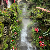 ['鲜花和水雾包围的坡面街道']