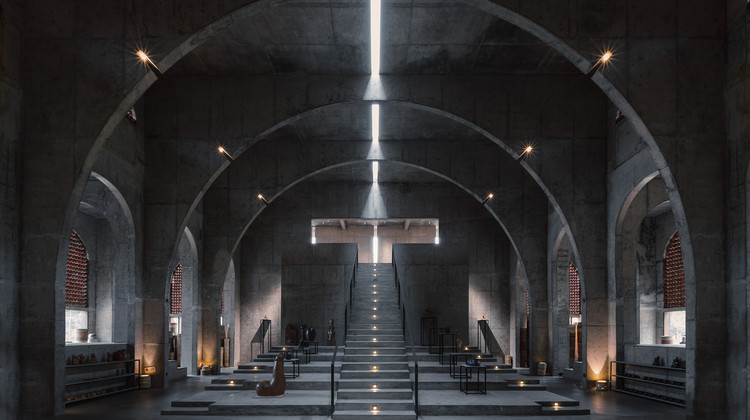 窑房大厅在烧窑时用来满窑、堆松材、点火、烧窑、开窑等,平时与侧廊二层为艺术馆作品展览空间。随着时代的变迁和传统工艺的濒临消失赋予了这座窑房特殊的文化和象征意义。这一空间如一座圣堂一般,为烧制瓷器这一行为塑造出一种神圣的仪式感。